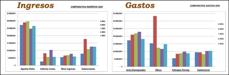 El pasado domingo 15 de febrero, en la eucaristía de las 12:00, se presentó el Boletín de las cuentas parroquiales del año 2025, con una comparativa anual de las partidas de ingresos y gastos.