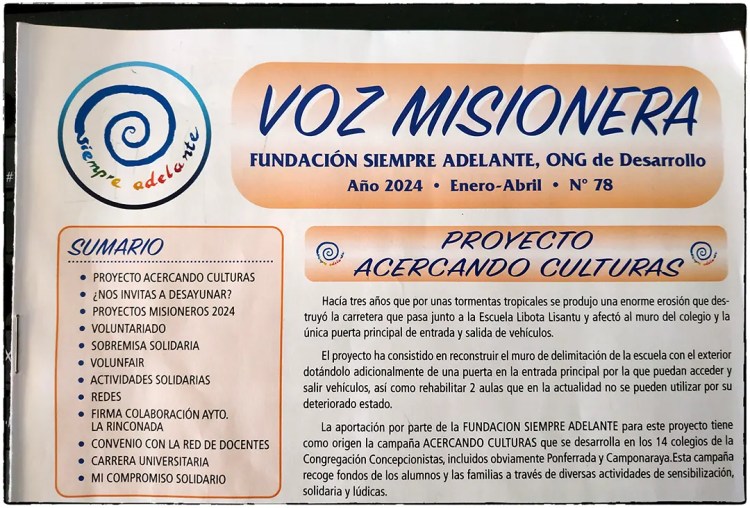 En el número 78 de la revista «Voz Misionera», la Fundación Siempre Adelante ha destacado la participación de nuestra parroquia en su proyecto. Como ya sabéis nuestra aportación ha sido a través de la recogida de fondos en las distintas “Sobremisas solidarias” que se han llevado a cabo.